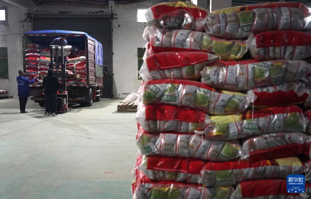 2月20日,在江西省宜黄县的一家种业公司仓库,工作人员在搬运即将外运的稻种。
