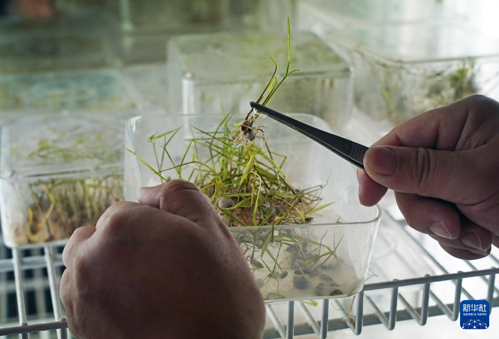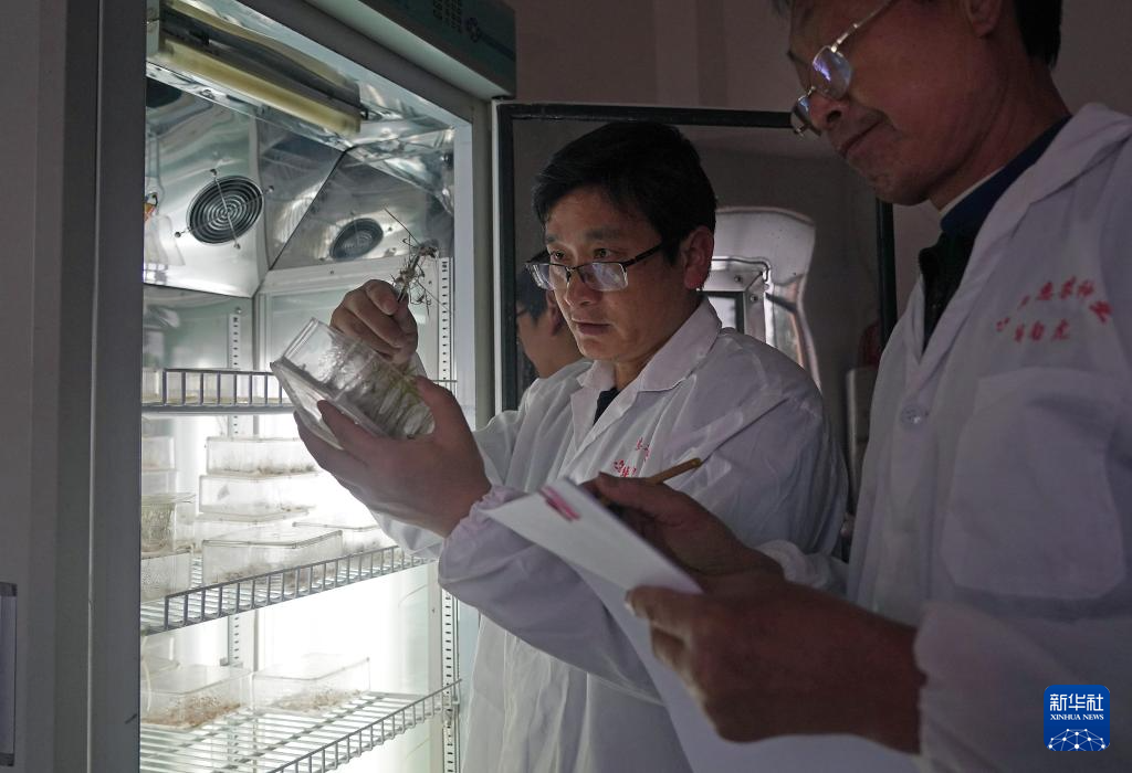 2月21日,在江西省宜黄县的一家种业公司检验室,技术人员在检测稻种。