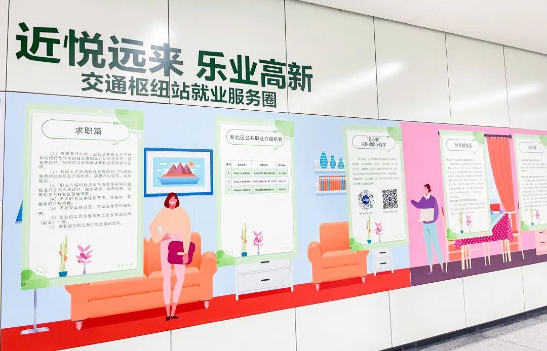 全新打造的交通枢纽站就业服务圈,充分利用站厅空间,对新北区的求职信息、培训服务、人才地图、人才公寓等进行了展示。