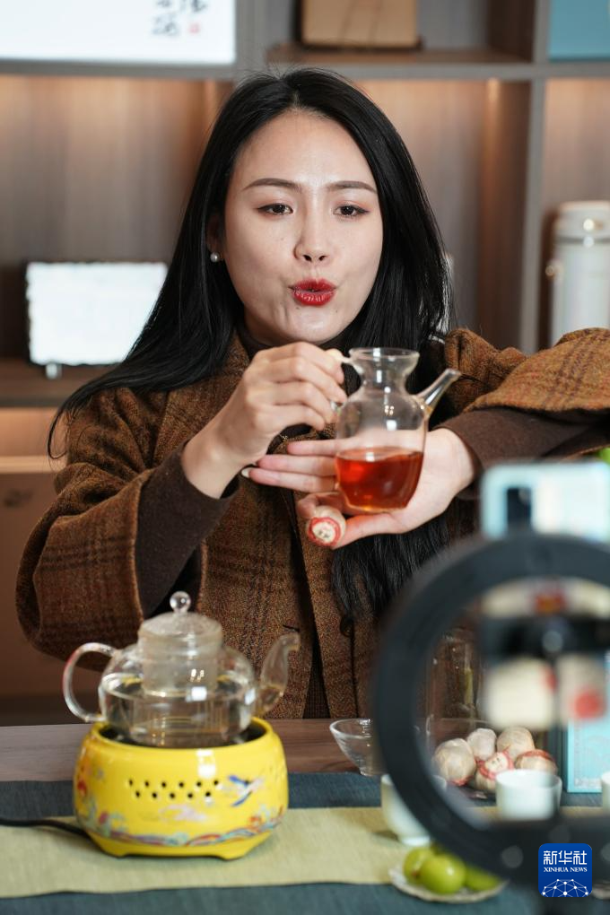 2月20日,林红梅在位于安康市紫阳县的公司内进行直播销售。林红梅从2015年开始在陕西省安康市紫阳县创办电商公司,从销售环节不断拓展,逐渐参与到加工生产当中,助力紫阳县及周边地区特色农产品产业发展,至今已累计销售2.17亿元。