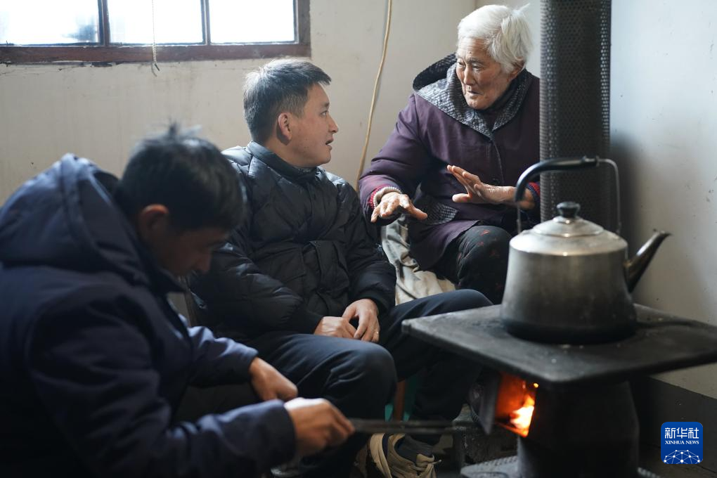 2月22日,张新斌(中)在他带动增收的安康市旬阳市城关镇殿湾村村民刘仕英(右)家中走访。张新斌从2016年开始,在陕西省安康市旬阳市等地帮助千余位留守老人发展产业增收,并将山货的产购销体系逐步发展至外省市,带动超过5000户农户增收。