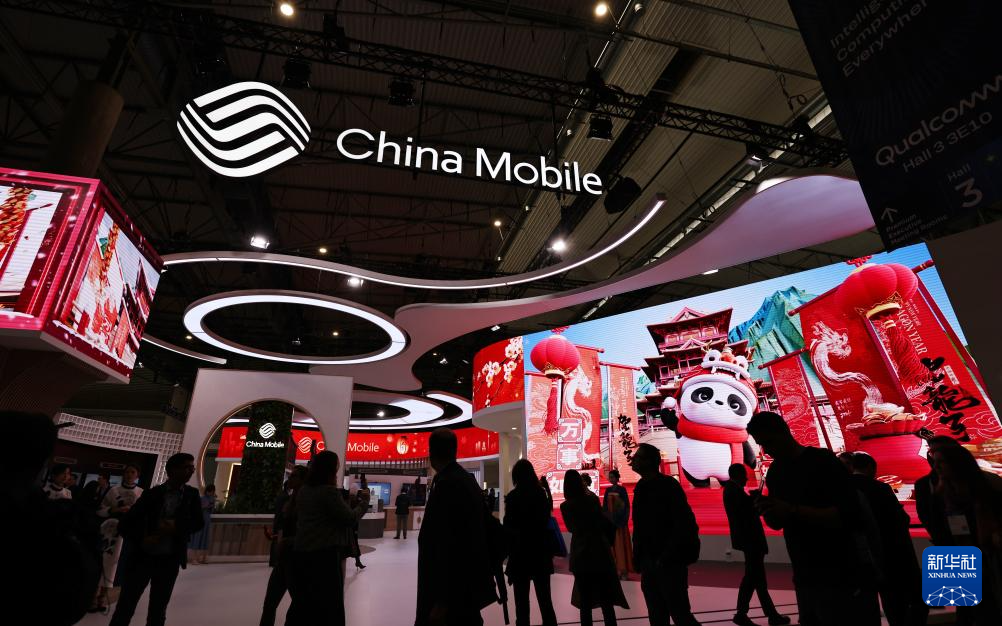 2月26日,在西班牙巴塞罗那,人们在2024年世界移动通信大会上参观中国移动展台。
