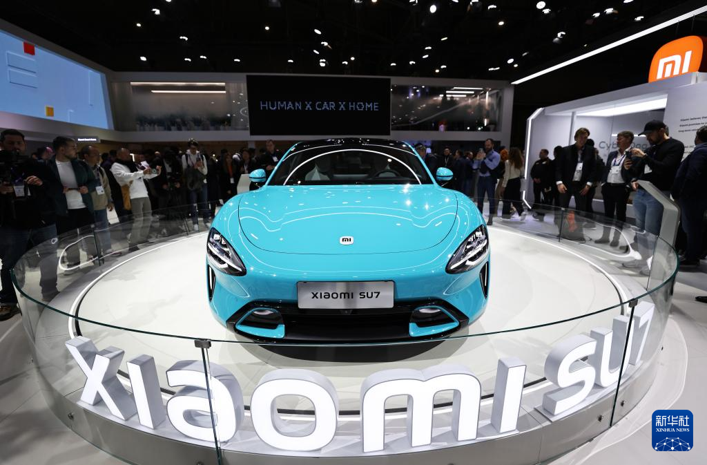 2月26日,在西班牙巴塞罗那举行的2024年世界移动通信大会上,人们参观小米SU7汽车。