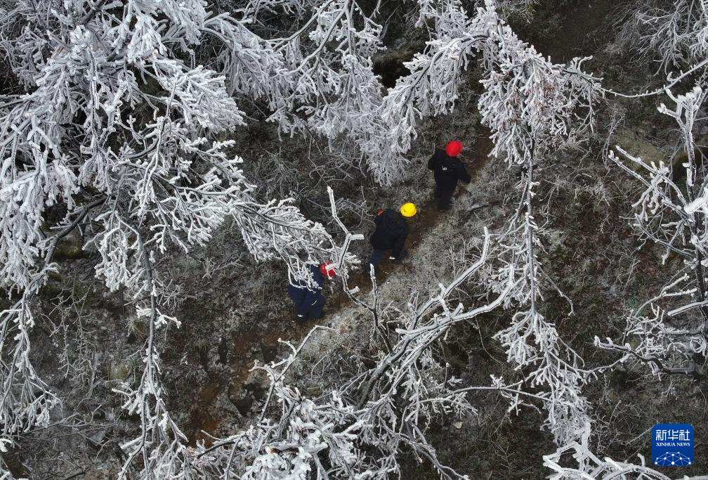 2月26日,在桂林市全州县东山瑶族乡,抢修队员上山观察线路覆冰情况(无人机照片)。