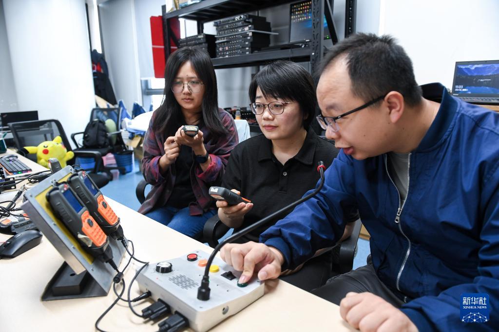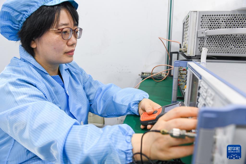 陈淑贤在实验室屏蔽房使用综测仪进行小区广播功能测试(2月20日摄)。