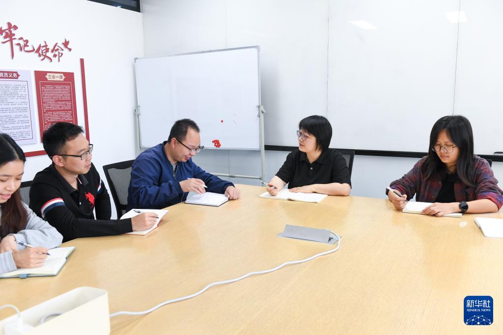 陈淑贤(右二)在办公室与部门同事开会时交流(2月20日摄)。