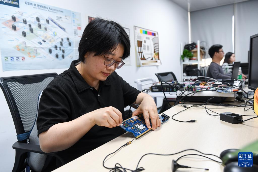 陈淑贤在办公室检查铁路综合数字移动通信系统无线数据模块(2月20日摄)。