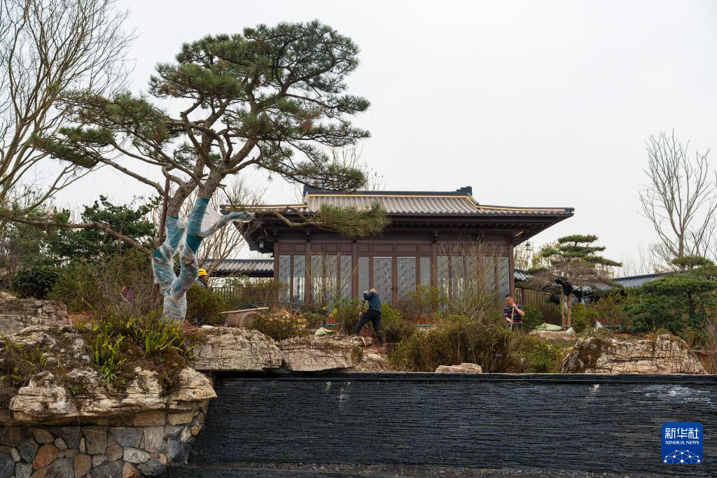 3月8日,施工人员对场馆外绿化带进行栽种和修剪。