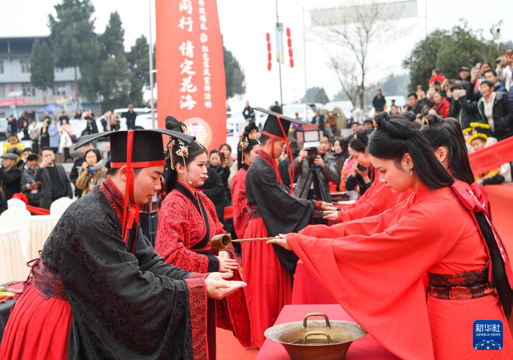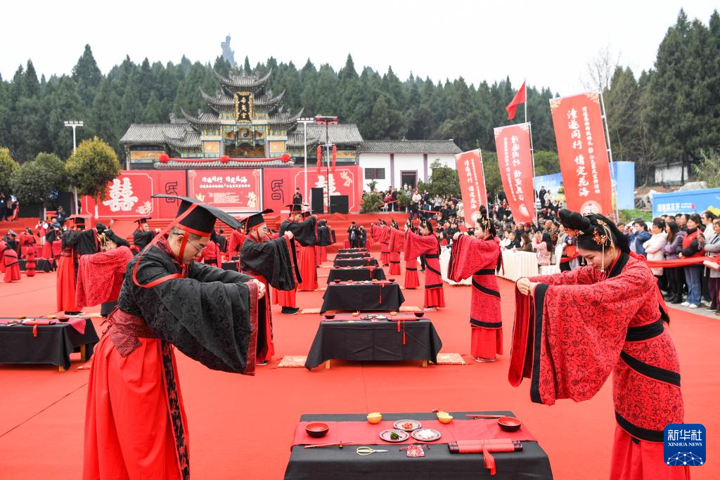 当日,重庆市潼南区民政局、四川省遂宁市民政局在重庆潼南区崇龛镇联合举办以“潼遂同行,情定花海”为主题的传统集体婚礼。来自潼南和遂宁的28对新人在亲朋好友和现场观众的见证下喜结良缘。