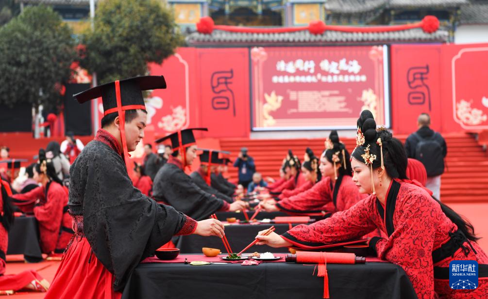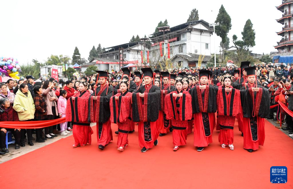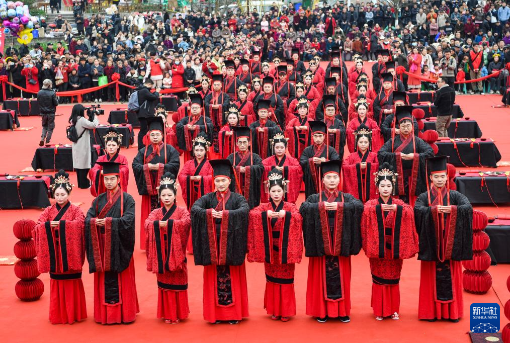这是3月9日在重庆市潼南区崇龛镇拍摄的传统集体婚礼现场。