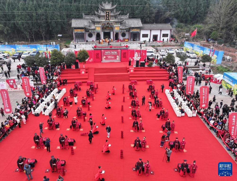 这是3月9日在重庆市潼南区崇龛镇拍摄的传统集体婚礼现场(无人机照片)。