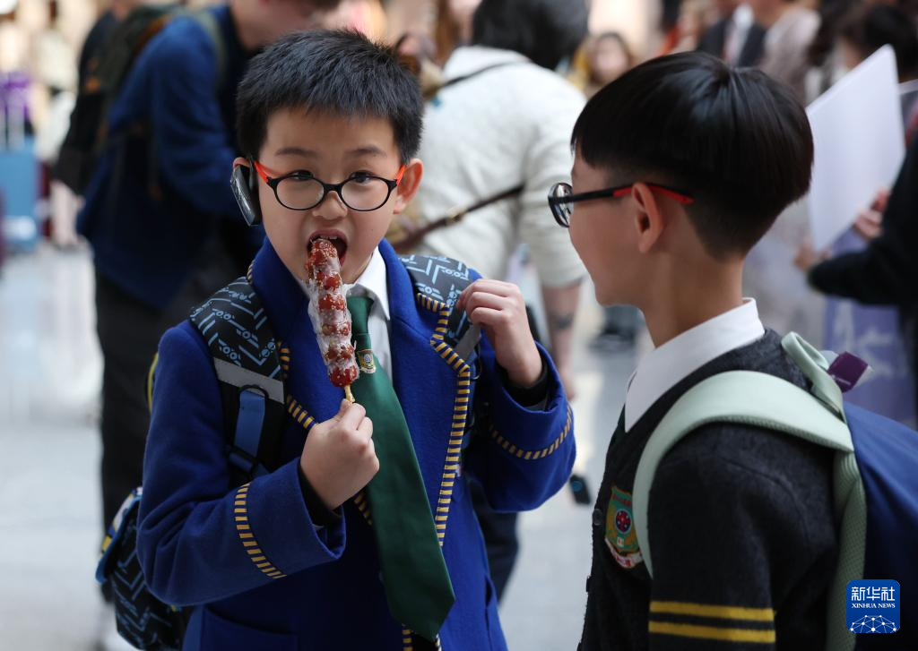 3月12日,一名香港小学生在大兴国际机场航站楼内品尝冰糖葫芦。