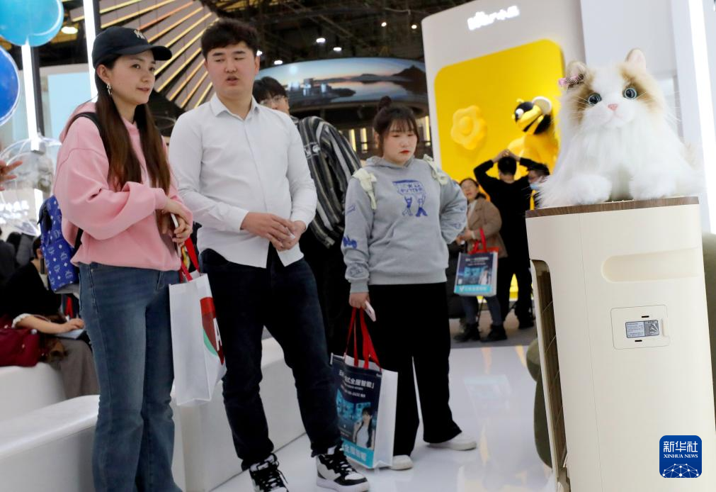 3月14日,参观者在飞利浦公司一款针对家庭宠物毛发的空气净化机产品前交流讨论。
