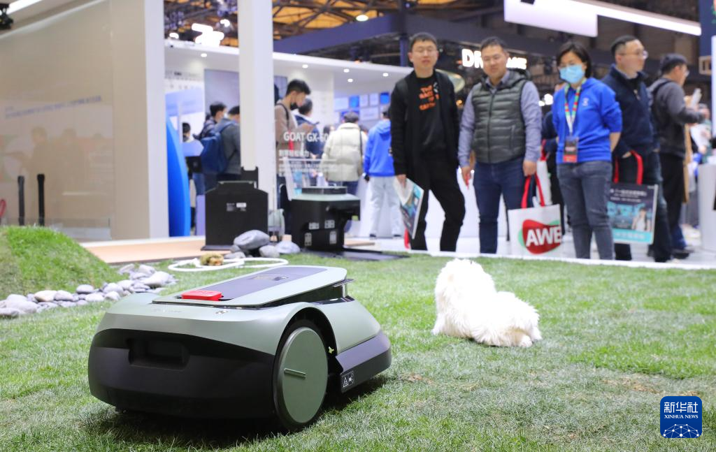 3月14日,一款来自科沃斯公司的割草机器人在展馆内进行模拟作业演示。