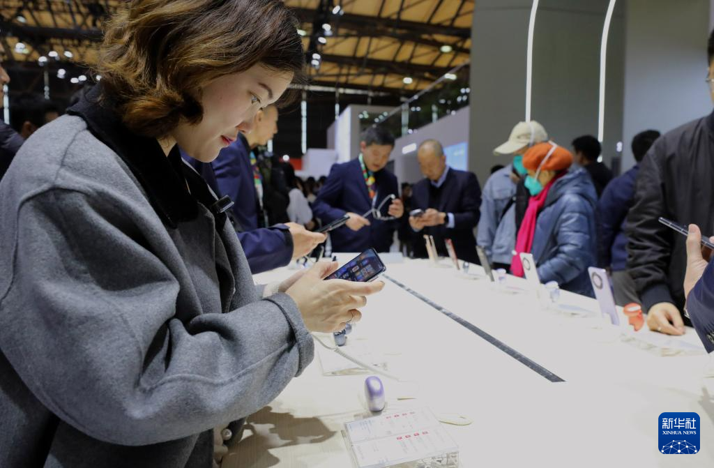 3月14日,参观者在徕芬公司的电动牙刷展台前交流讨论。