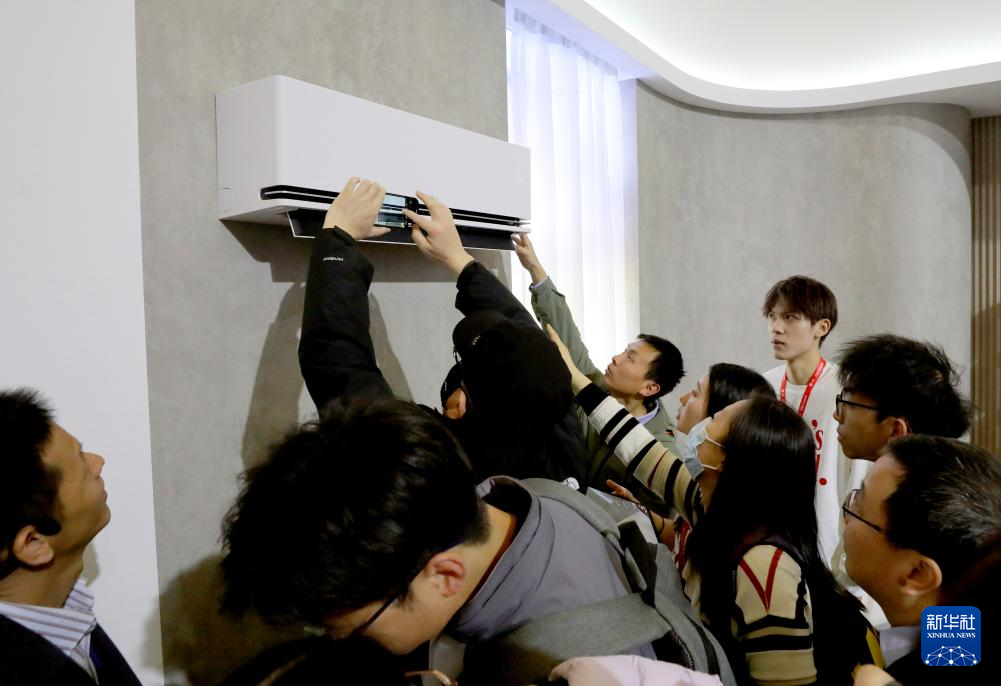 3月14日,参观者在LG公司展台上体验一个新款空调展品。