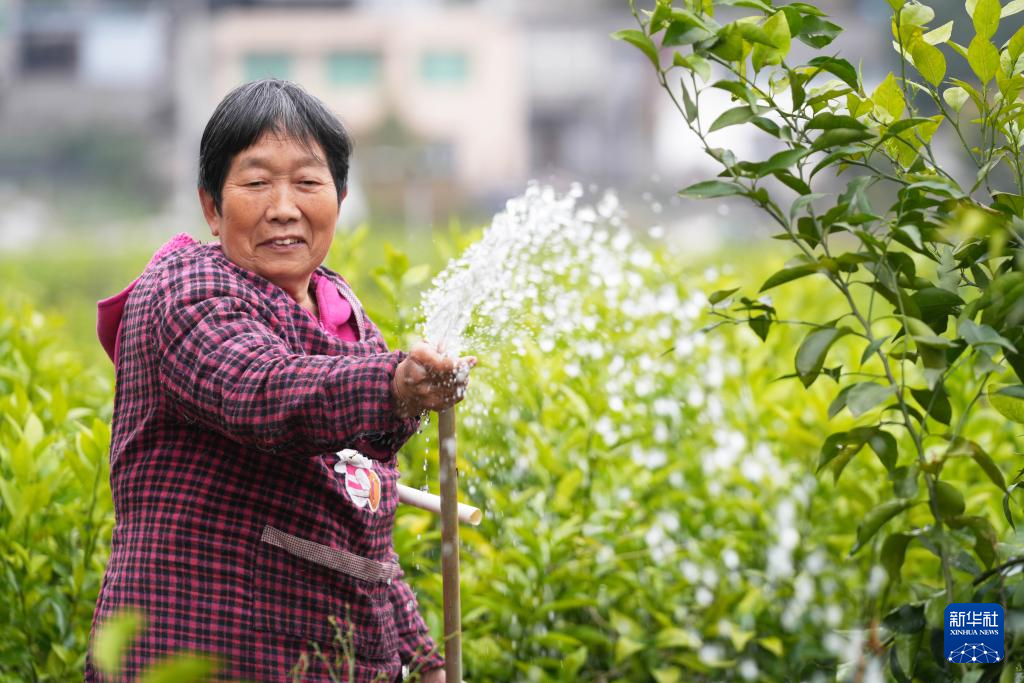 3月17日,在重庆市北碚区澄江镇一柑橘种苗基地,工人在给柑橘种苗浇水。