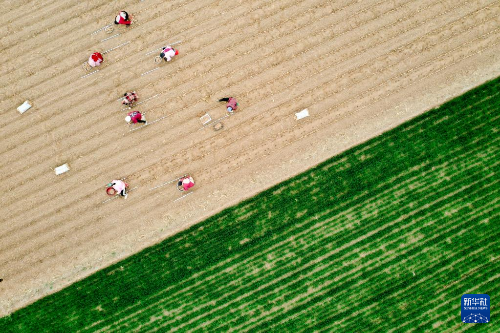 3月17日,河南省焦作市温县黄庄镇南韩村农民在田间种植铁棍山药(无人机照片)。
