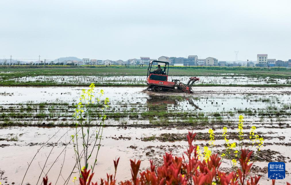 3月17日,在湖南省衡阳市衡阳县西渡镇青里村,村民驾驶农机翻耕农田(无人机照片)。