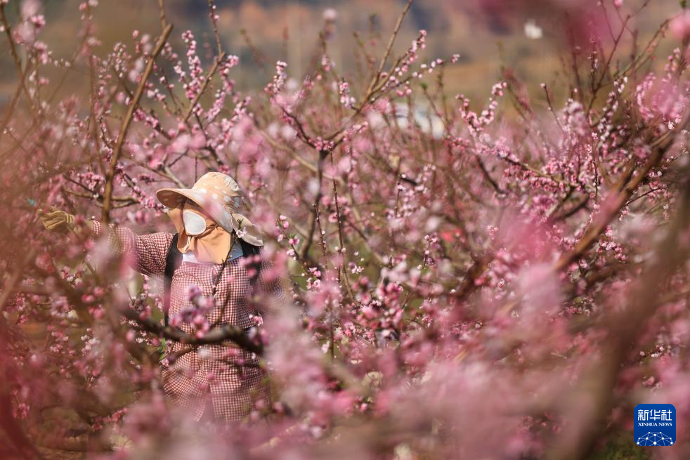 3月17日,在云南省曲靖市沾益区盘江镇河西村桃园基地,果农在果园进行管护作业。