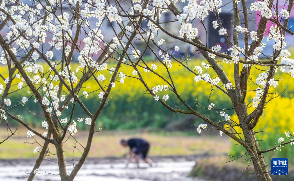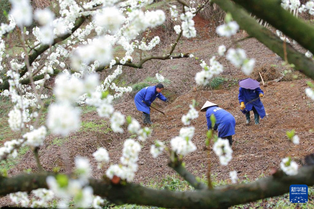 3月17日,在贵州省铜仁市玉屏侗族自治县朱家场镇混寨村,村民在李花间整地。