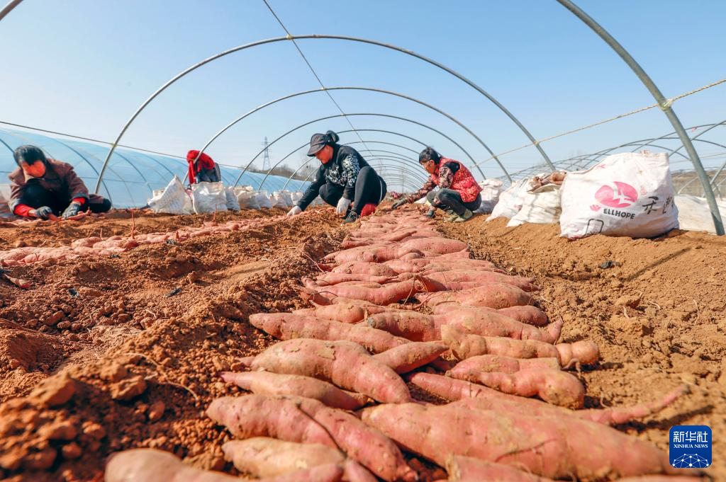 3月17日,河北省遵化市刘备寨乡水峪村农民在红薯育秧暖棚摆放红薯。