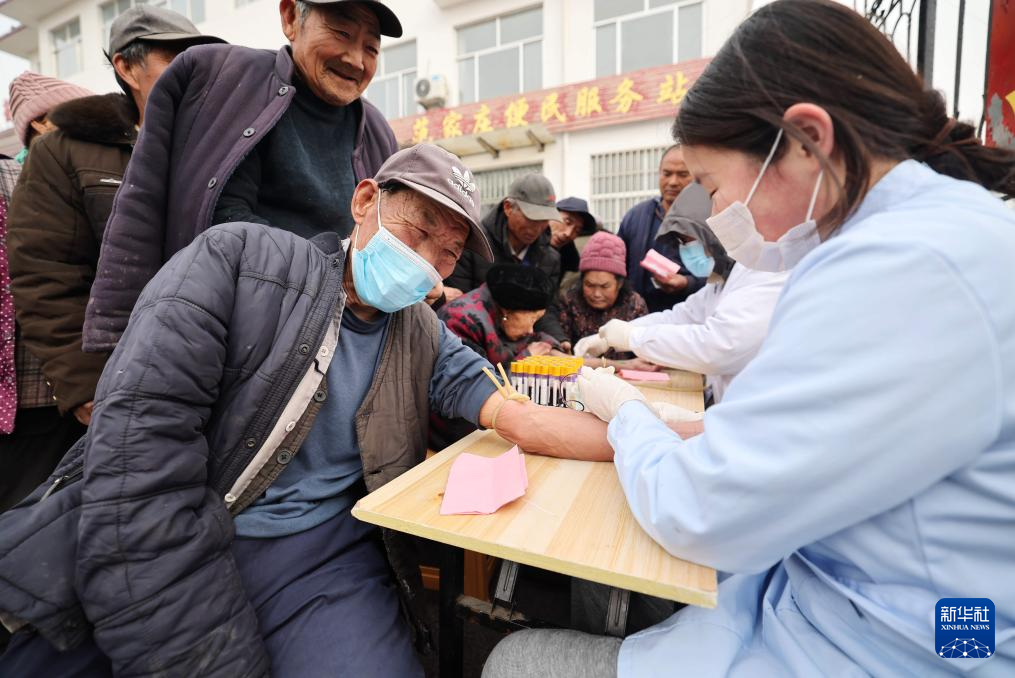 3月17日,在山东省临沂市沂南县铜井镇范家庄村,医务人员为老年人抽血检查。