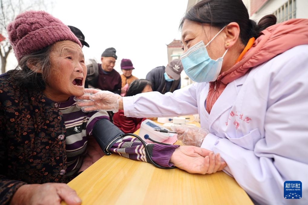 3月17日,在山东省临沂市沂南县铜井镇范家庄村,医务人员为老年人查体。
