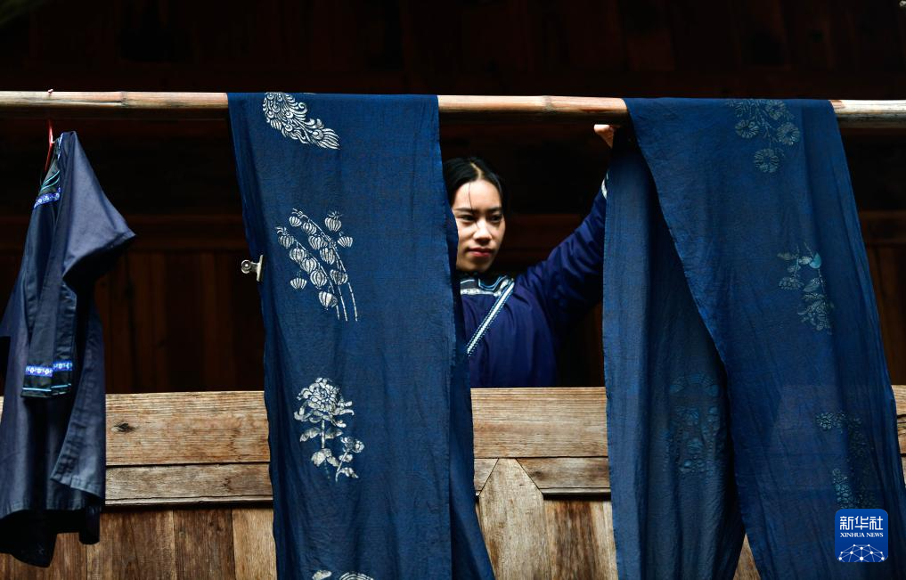 3月18日,贵州省榕江县栽麻镇大利侗寨的村民在晾晒侗布。