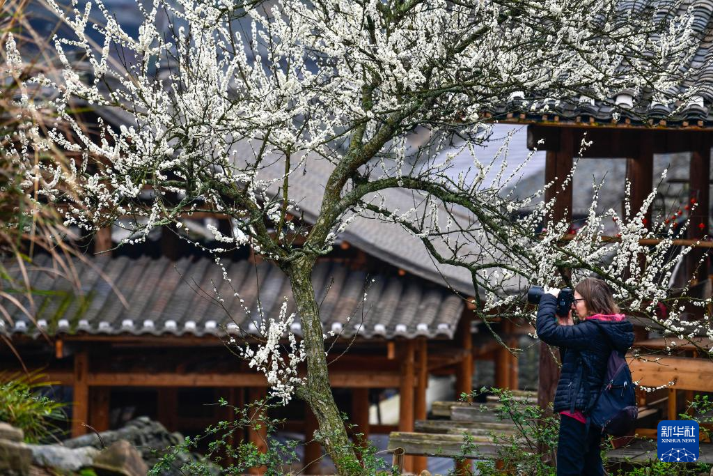 3月18日,一名外籍游客在贵州省榕江县栽麻镇大利侗寨拍照。