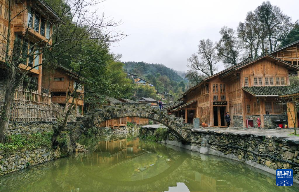 3月18日,在贵州省榕江县栽麻镇大利侗寨,村民从月亮山居民宿的小石桥上经过(无人机照片)。