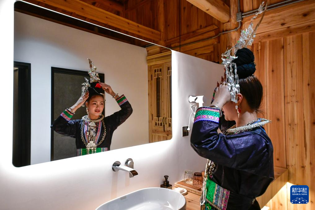 3月17日,村民在贵州省榕江县栽麻镇大利侗寨月亮山居民宿里整理银饰。