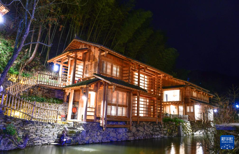 这是3月17日拍摄的贵州省榕江县栽麻镇大利侗寨月亮山居民宿夜景。