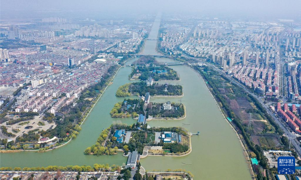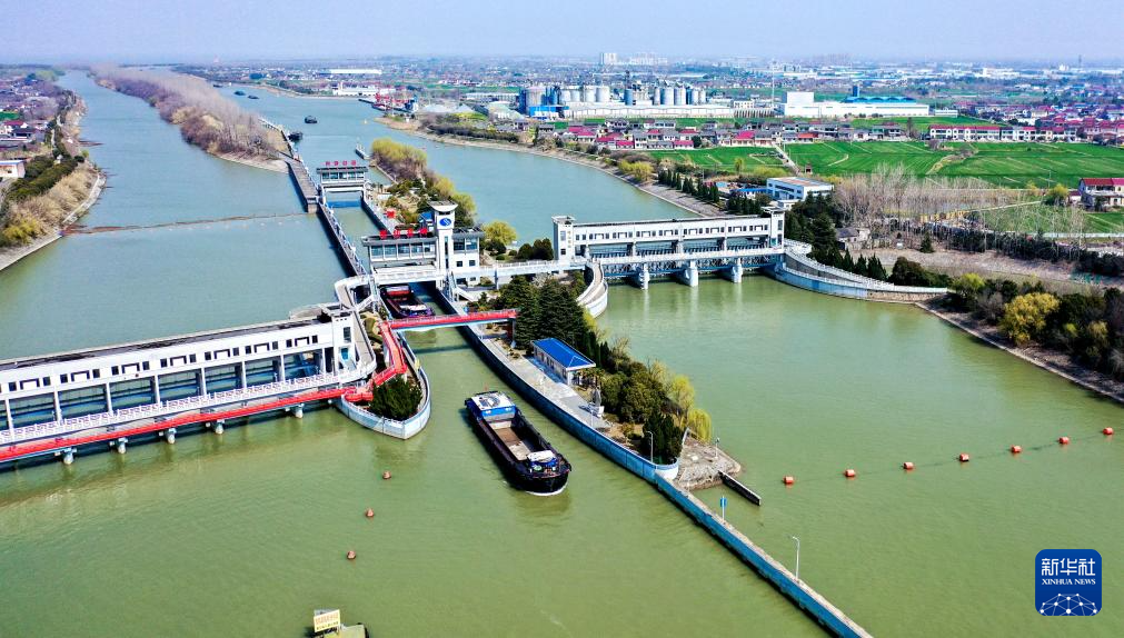 这是3月19日拍摄的位于江苏省扬州市江都区的南水北调东线一期工程运盐闸、邵仙套闸、邵仙闸洞(无人机照片)。