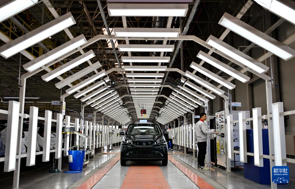 3月19日,奇瑞新能源汽车股份有限公司石家庄分公司的工人在总装车间生产线上工作。