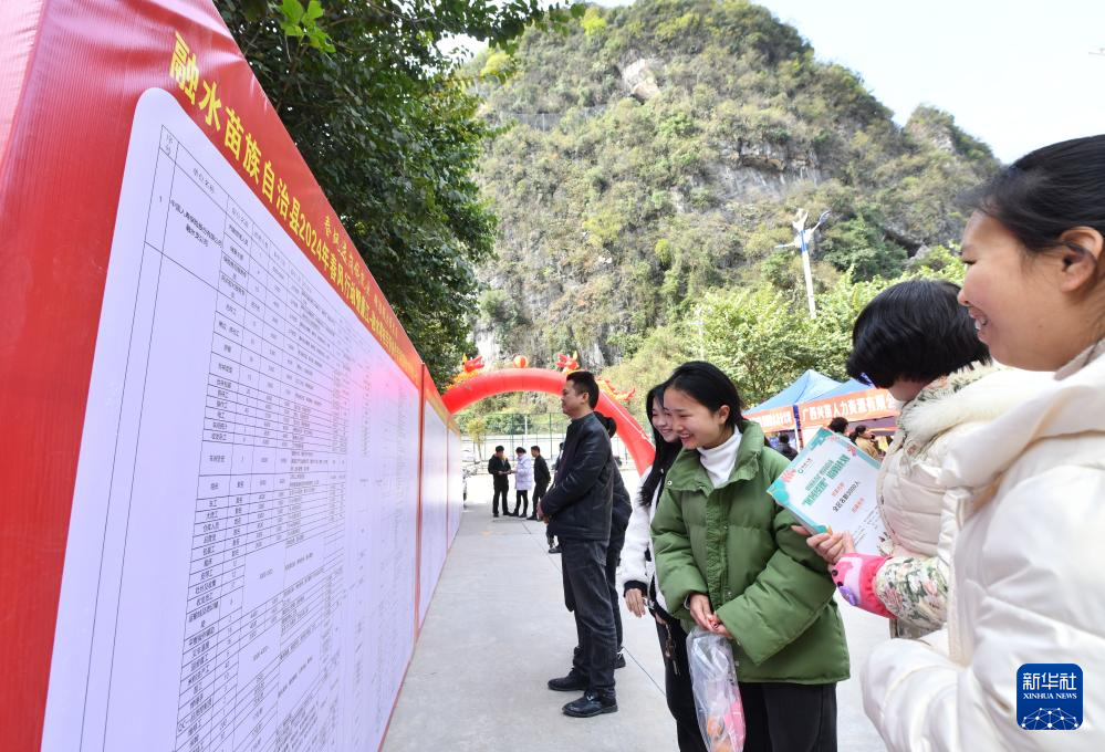 3月19日,在柳州市融水苗族自治县易地扶贫安置点苗家小镇,求职者浏览岗位需求。