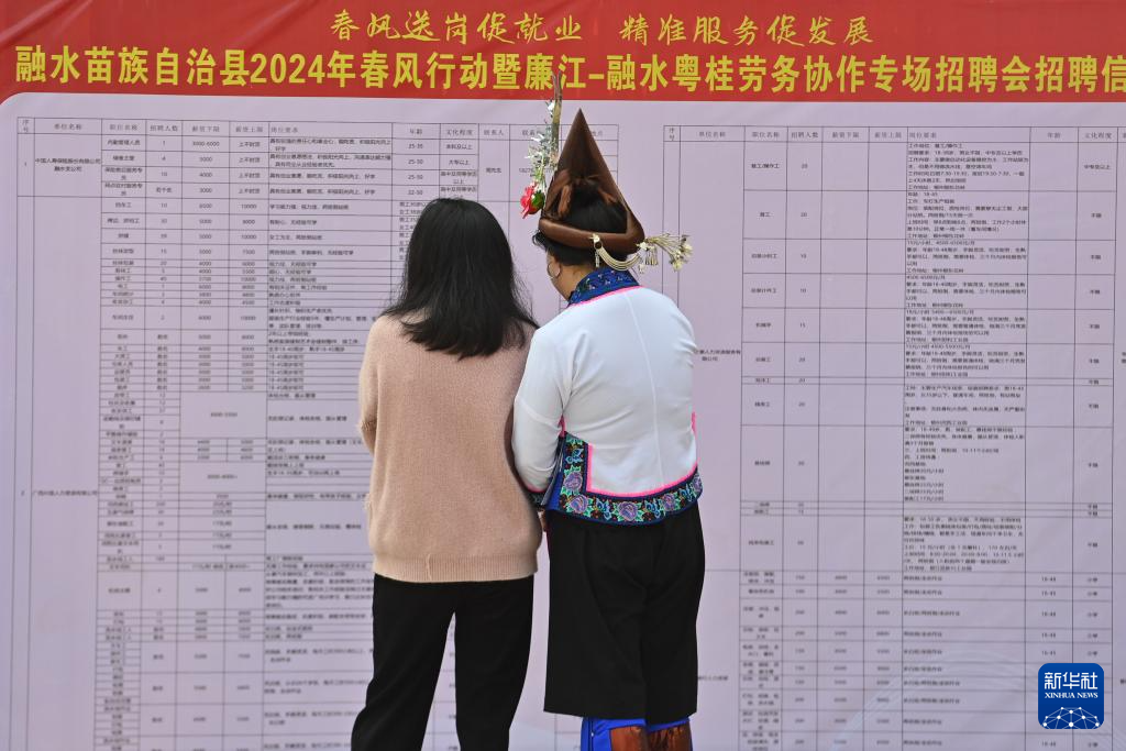 当日,广西柳州市融水苗族自治县和结对帮扶的广东省廉江市联合举办春风行动暨粤桂劳务协作专场招聘会,两地人社部门为用工企业与融水脱贫人口、易地扶贫搬迁劳动力等搭建双向招聘就业服务平台,进一步深化粤桂劳务协作,促进乡村振兴。