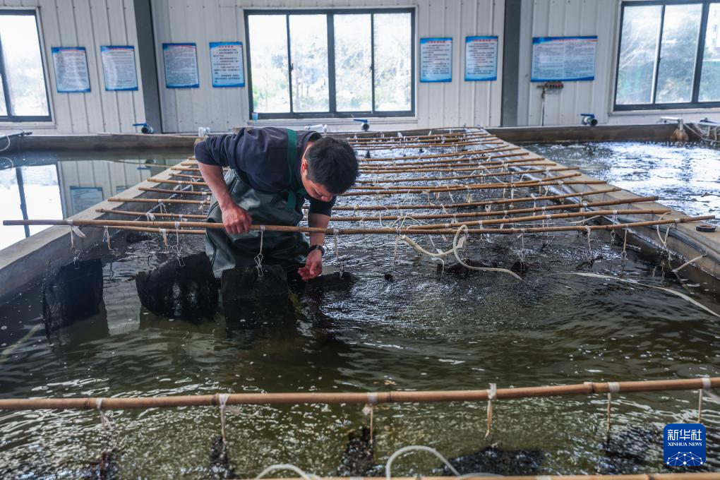 3月19日,在位于湖州市吴兴区东林镇保健村的湖旺水产基地孵化池内,工作人员在查看棕片上覆盖的鱼卵的孵化进度。