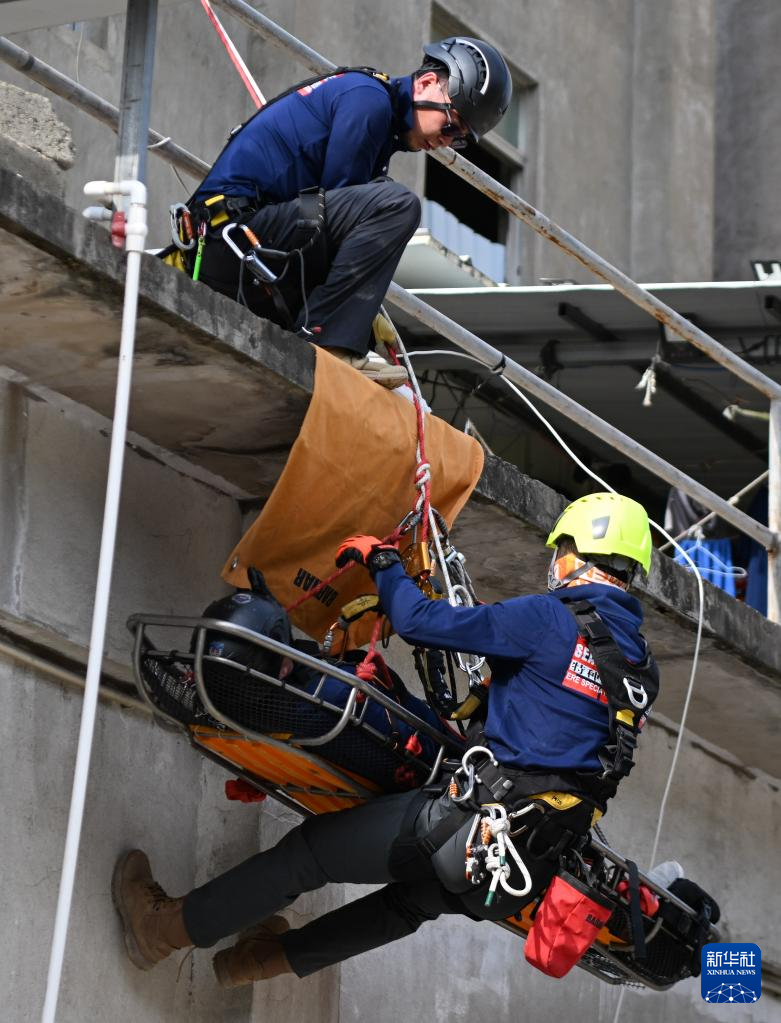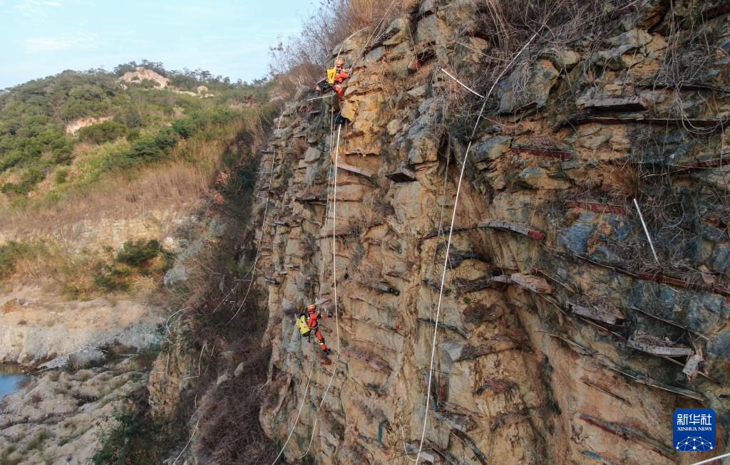 3月20日,消防员在进行山岳崖壁救援演练(无人机照片)。