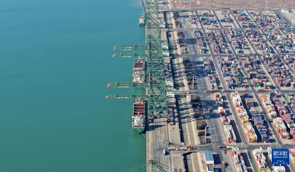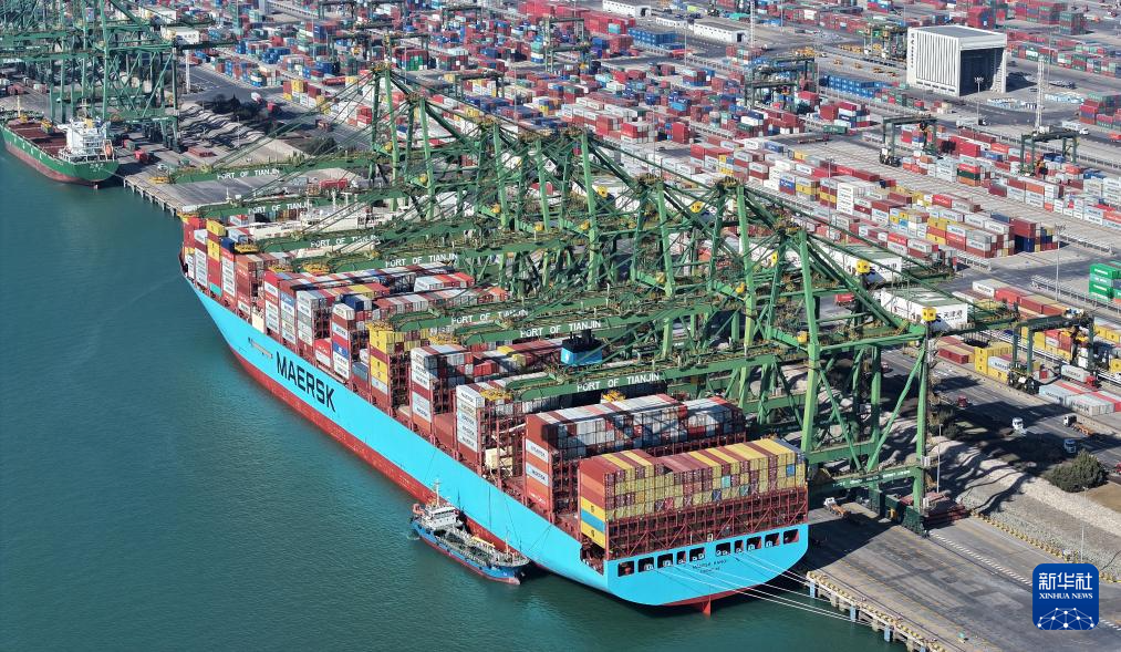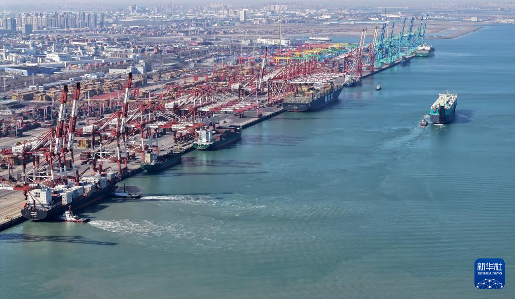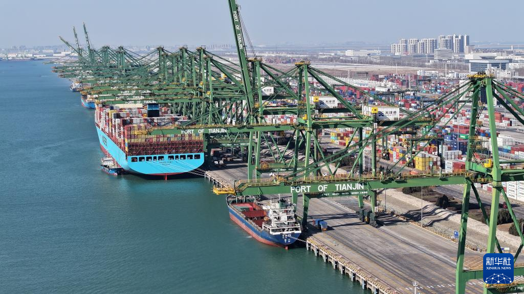 3月20日,货轮靠泊在天津港北航道内的泊位中(无人机照片)。