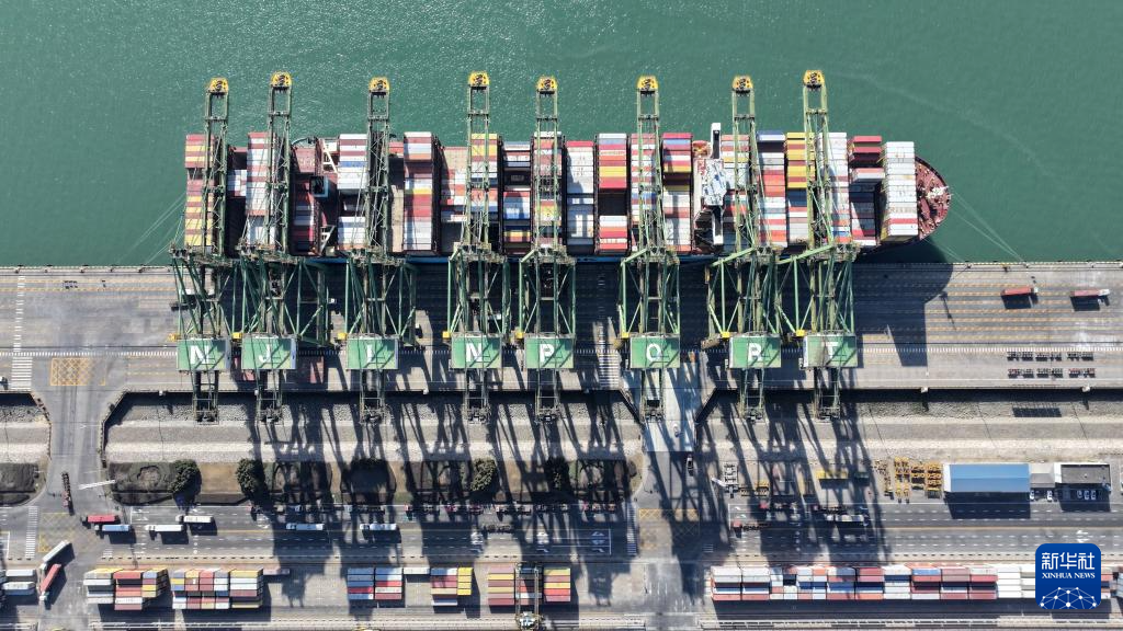 3月20日,一艘货轮靠泊在天津港北航道内的泊位中(无人机照片)。