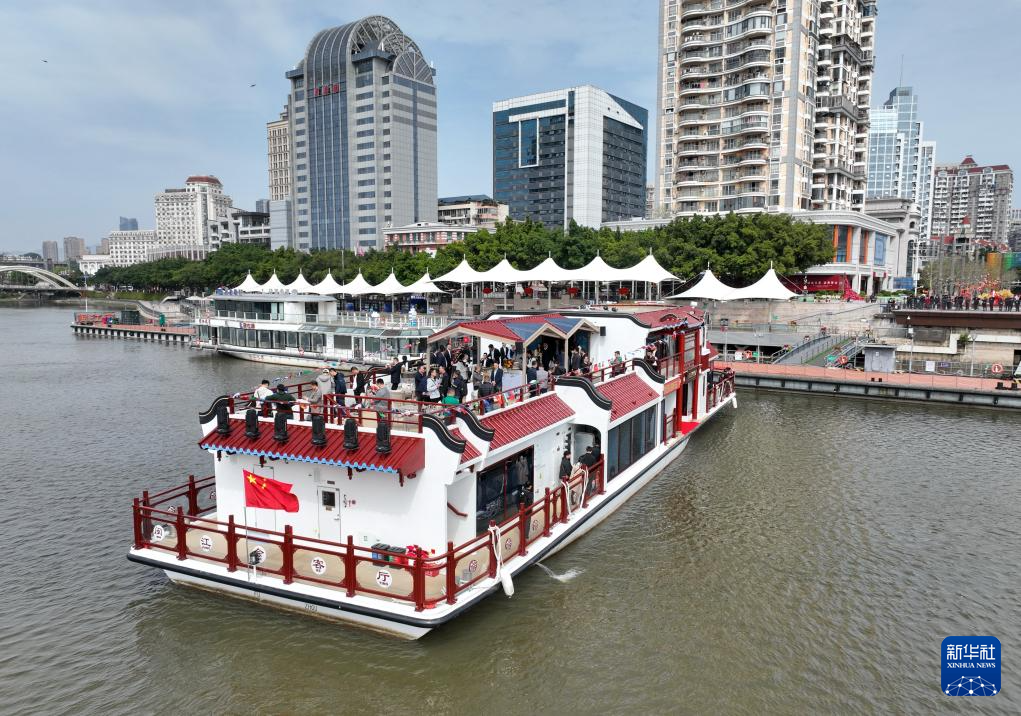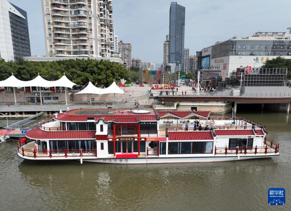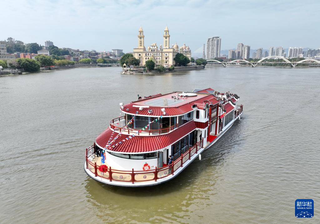 3月21日,“闽江会客厅”纯电动客船在闽江行驶(无人机照片)。
