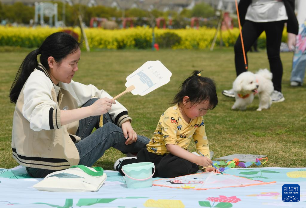 3月30日,一对母女在油菜花地旁参加亲子活动。