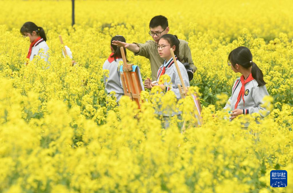 3月30日,湖州市吴兴区第一小学学生在油菜花地里写生。