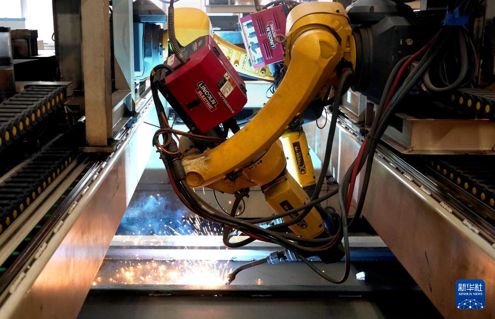 在卫华集团的智能轻型车间内,主梁焊接机器人在进行起重机主梁腹板与水平角钢焊接作业(3月14日摄)。