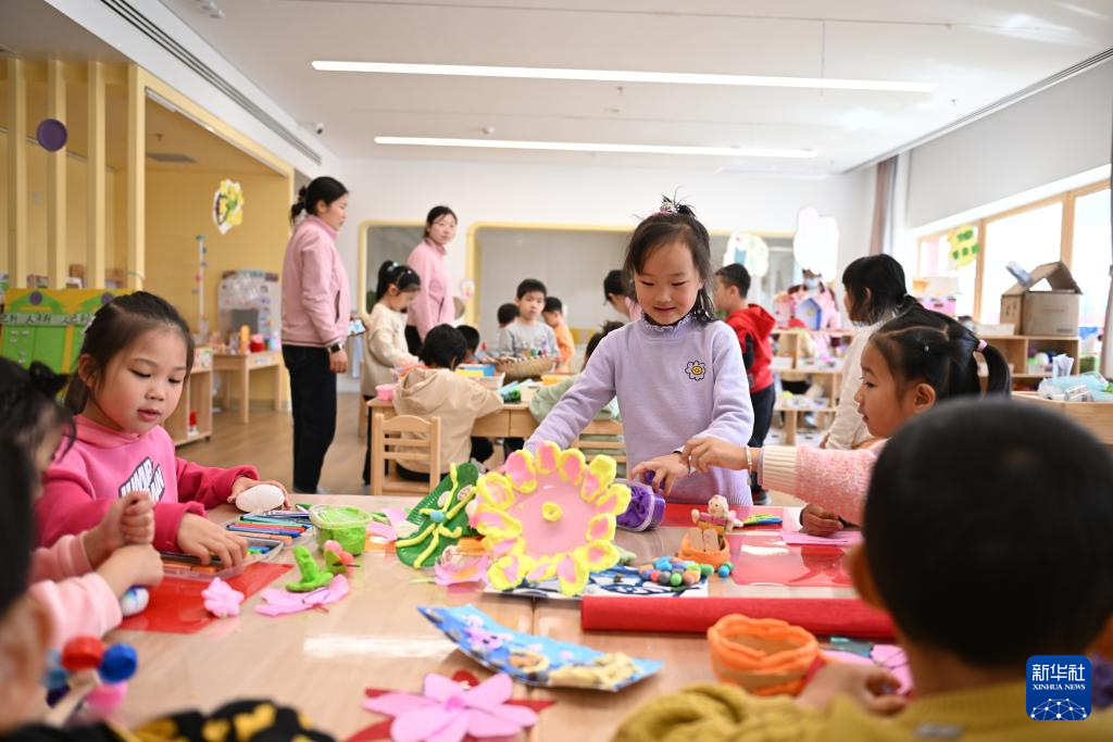 3月29日,雄安北海幼儿园的孩子们在教室内做手工。