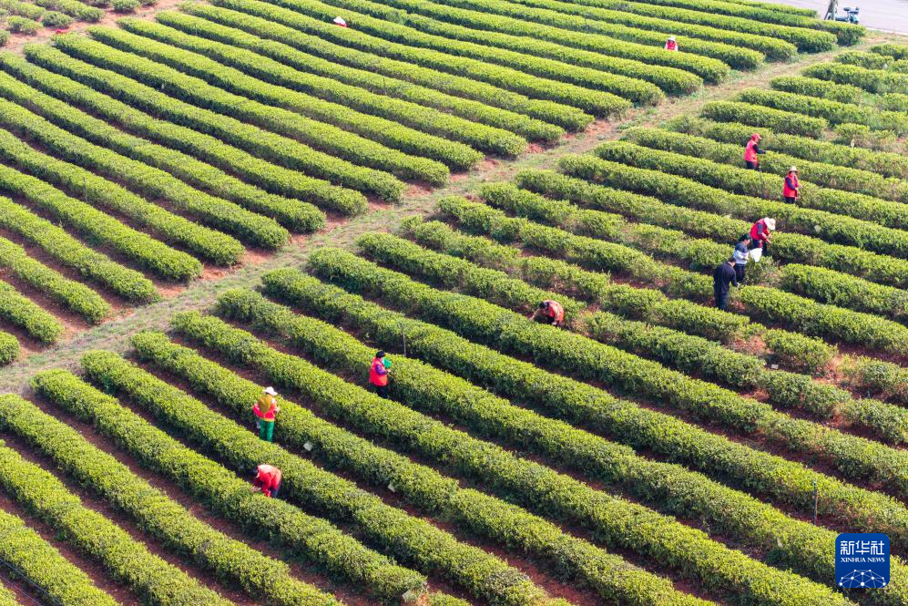 3月31日,茶农在长沙望城乌山贡茶基地采摘春茶(无人机照片)。