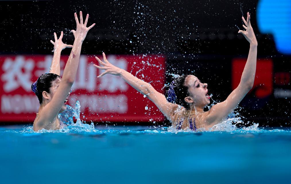 4月7日,中国组合林彦含/徐汇妍(右)在比赛中。当日,在国家游泳中心“水立方”举行的2024年花样游泳世界杯(北京站)女子双人自由自选比赛中,中国组合林彦含/徐汇妍以221.0156分的成绩获得亚军。新华社记者 夏一方 摄