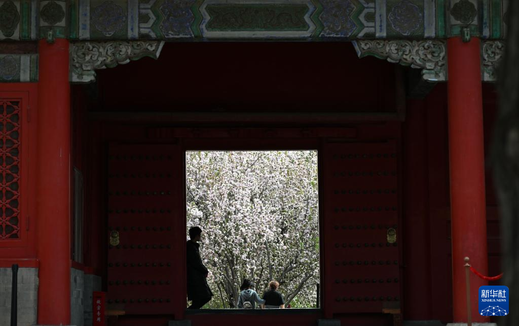 4月7日,游客在故宫内赏花。