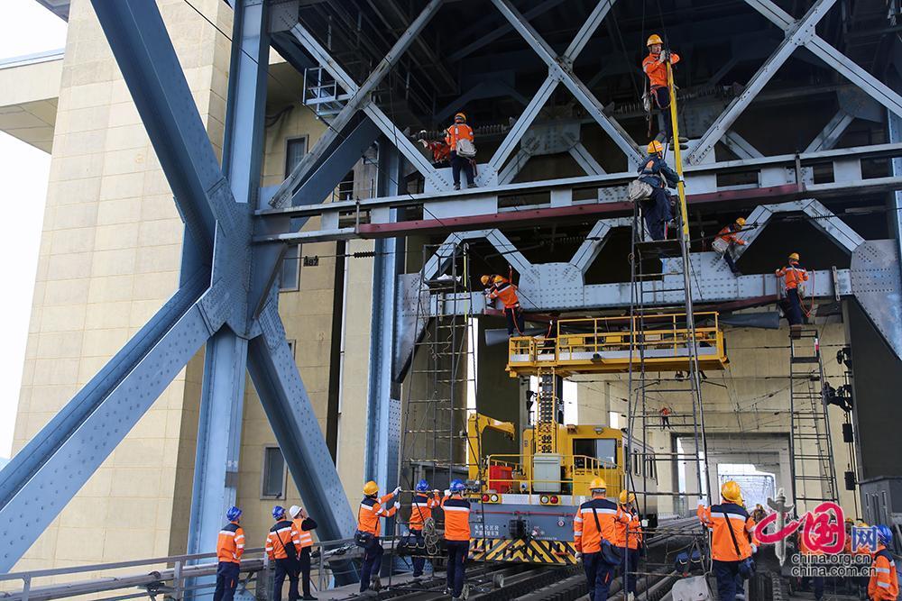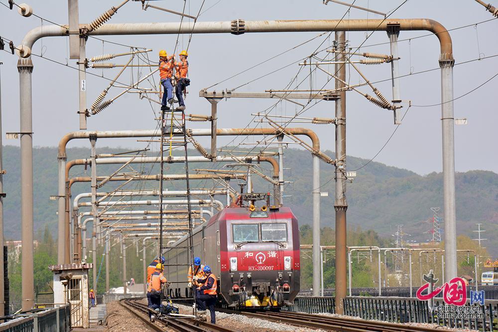 4月7日,中铁电气化局运管公司上海维管处南京维管段作业人员对主桥进行检修。王子龙摄